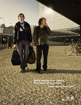 Another social ad which refers very ironically to smokers and their addiction. Be nice to smokers. They won't live as long as you. Belgian ad.